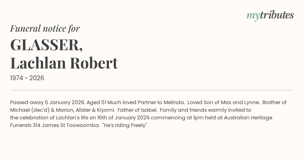 21°CPassed away 6 January 2026. Aged 51 Much loved Partner to Melinda. Loved Son of Max and Lynne. Brother of Michael (dec'd) & Marion, Alister & Kiyomi. Father of Isabel. Family and friends warmly invited to the celebration of Lachlan's life on 16th of January 2026 commencing at 1pm held at Australian Heritage Funerals 314 James St Toowoomba. "He's riding Freely"