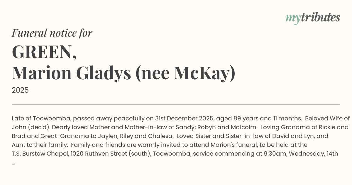 Family and friends are warmly invited to attend Marion's funeral, to be held at the T.S. Burstow Chapel, 1020 Ruthven Street (south), Toowoomba, service commencing at 9:30am, Wednesday, 14th January 2026 followed by interment at the Garden of Remembrance.