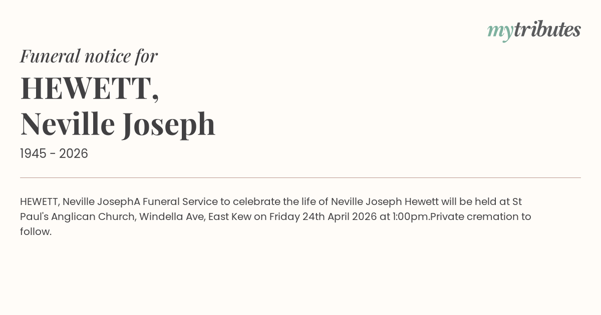 A Funeral Service to celebrate the life of Neville Joseph Hewett will be held at St Paul's Anglican Church, Windella Ave, East Kew on Friday 24th April 2026 at 1:00pm.