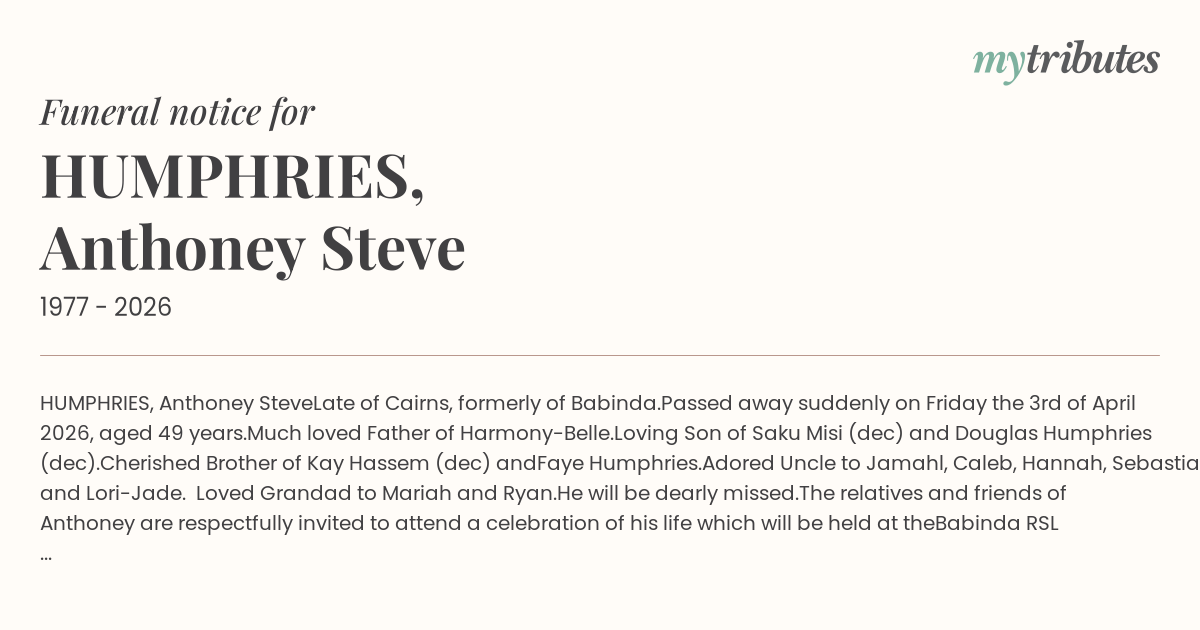Passed away suddenly on Friday the 3rd of April 2026, aged 49 years.