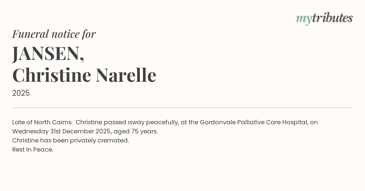 21°CLate of North Cairns. Christine passed away peacefully, at the Gordonvale Palliative Care Hospital, on Wednesday 31st December 2025, aged 75 years.