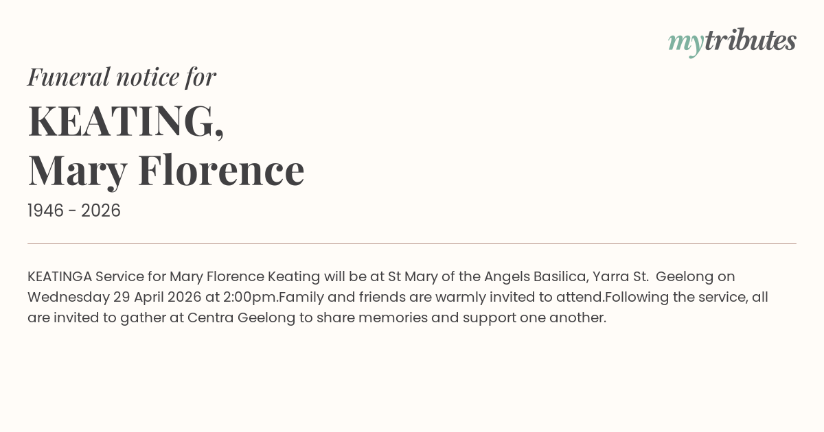 A Service for Mary Florence Keating will be at St Mary of the Angels Basilica, Yarra St. Geelong on Wednesday 29 April 2026 at 2:00pm.
