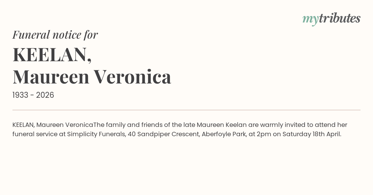 The family and friends of the late Maureen Keelan are warmly invited to attend her funeral service at Simplicity Funerals, 40 Sandpiper Crescent, Aberfoyle Park, at 2pm on Saturday 18th April.