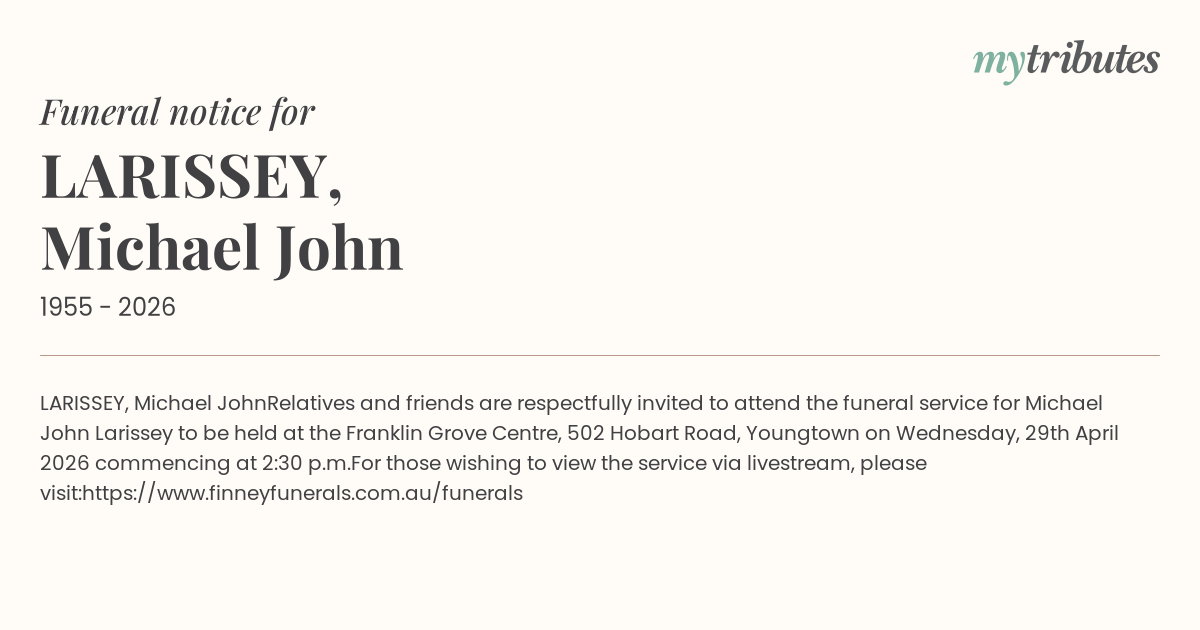 Relatives and friends are respectfully invited to attend the funeral service for Michael John Larissey to be held at the Franklin Grove Centre, 502 Hobart Road, Youngtown on Wednesday, 29th April 2026 commencing at 2:30 p.m.