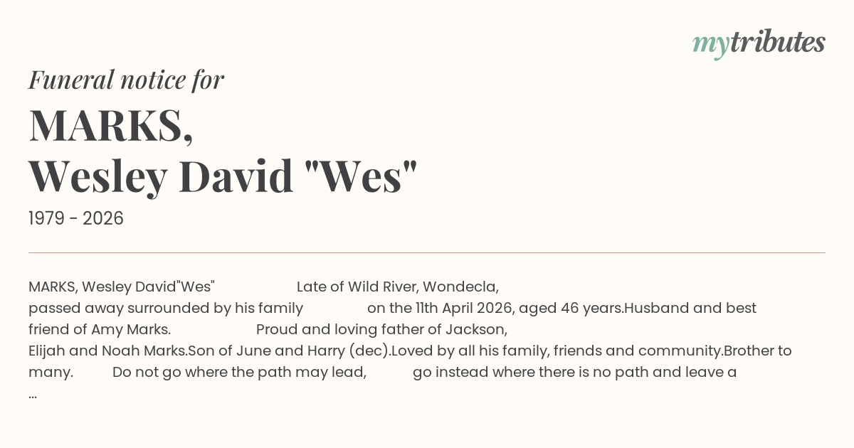 Late of Wild River, Wondecla, passed away surrounded by his family on the 11th April 2026, aged 46 years.