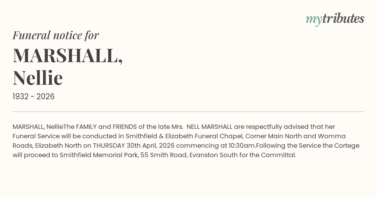 Mrs. NELL MARSHALL are respectfully advised that her Funeral Service will be conducted in