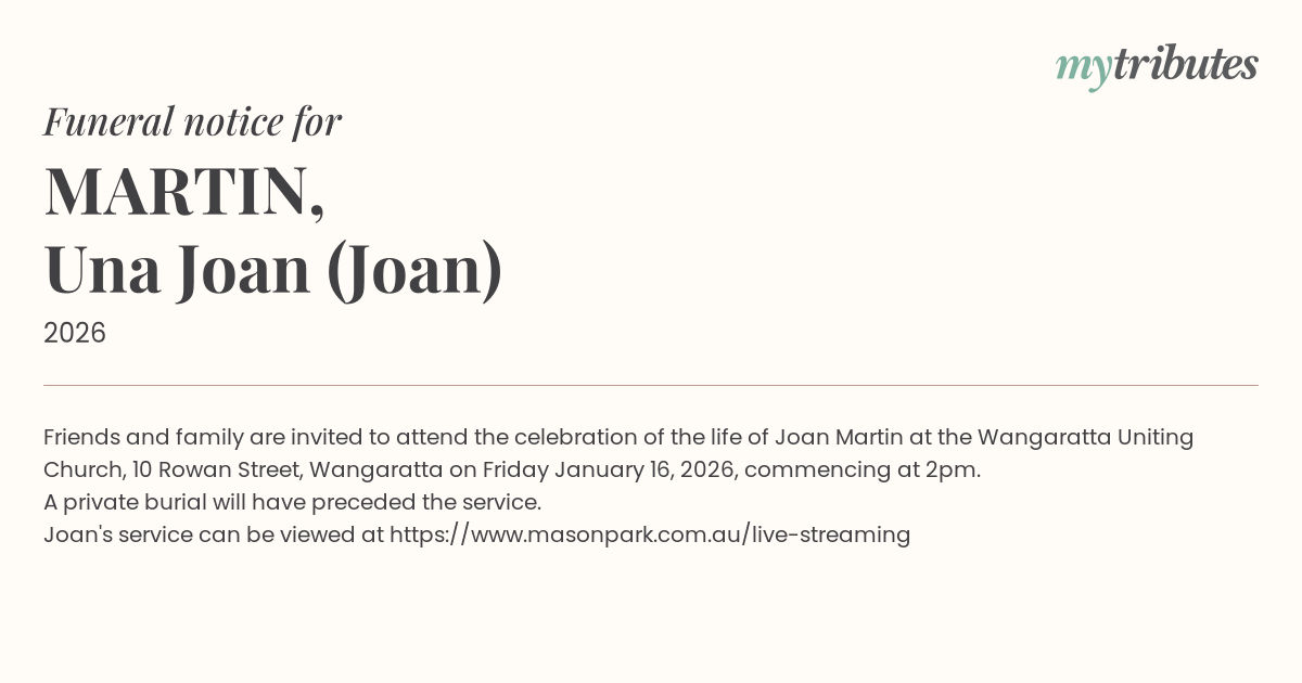 21°CFriends and family are invited to attend the celebration of the life of Joan Martin at the Wangaratta Uniting Church, 10 Rowan Street, Wangaratta on Friday January 16, 2026, commencing at 2pm.