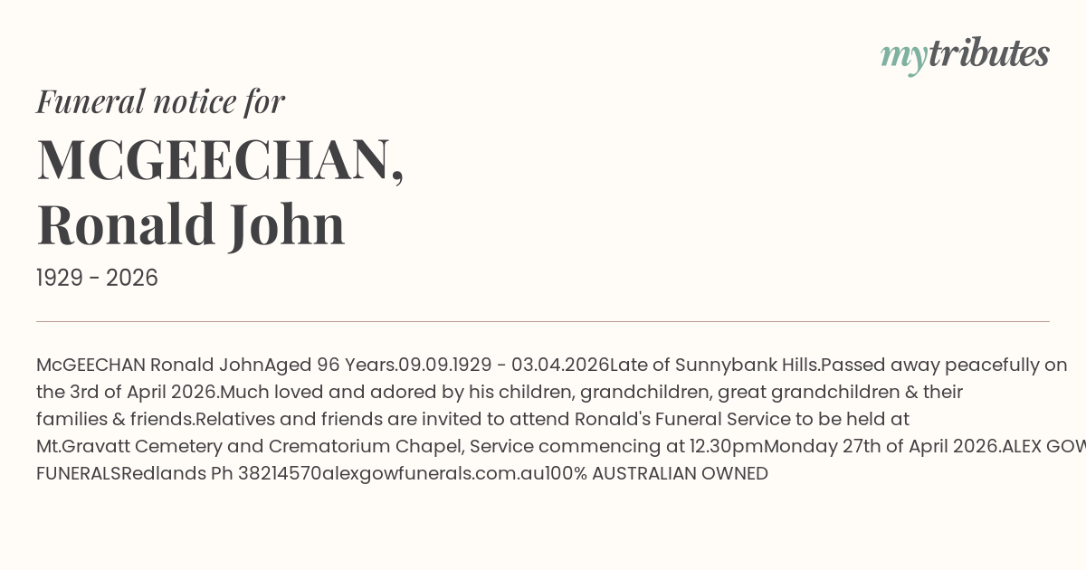 Relatives and friends are invited to attend Ronald's Funeral Service to be held at Mt.Gravatt Cemetery and Crematorium Chapel,
