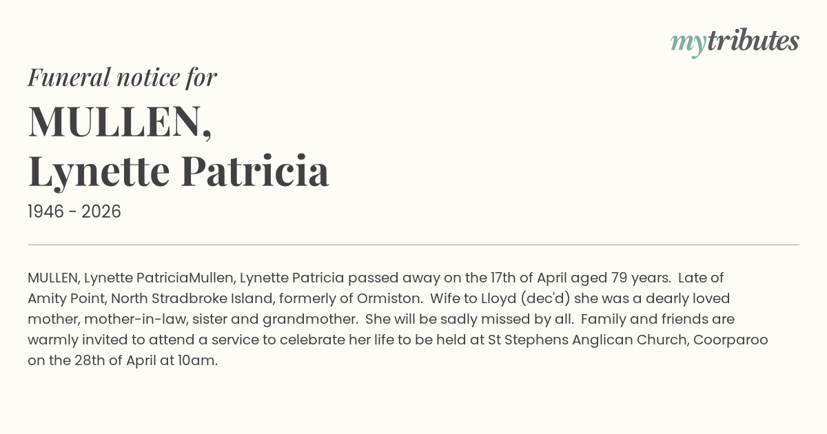 Mullen, Lynette Patricia passed away on the 17th of April aged 79 years. Late of Amity Point, North Stradbroke Island, formerly of Ormiston. Wife to Lloyd (dec'd) she was a dearly loved mother, mother-in-law, sister and grandmother. She will be sadly missed by all. Family and friends are warmly invited to attend a service to celebrate her life to be held at St Stephens Anglican Church, Coorparoo on the 28th of April at 10am.