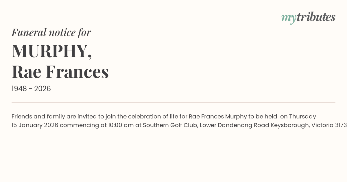 21°CFriends and family are invited to join the celebration of life for Rae Frances Murphy to be held on Thursday 15 January 2026 commencing at 10:00 am at Southern Golf Club, Lower Dandenong Road Keysborough, Victoria 3173.