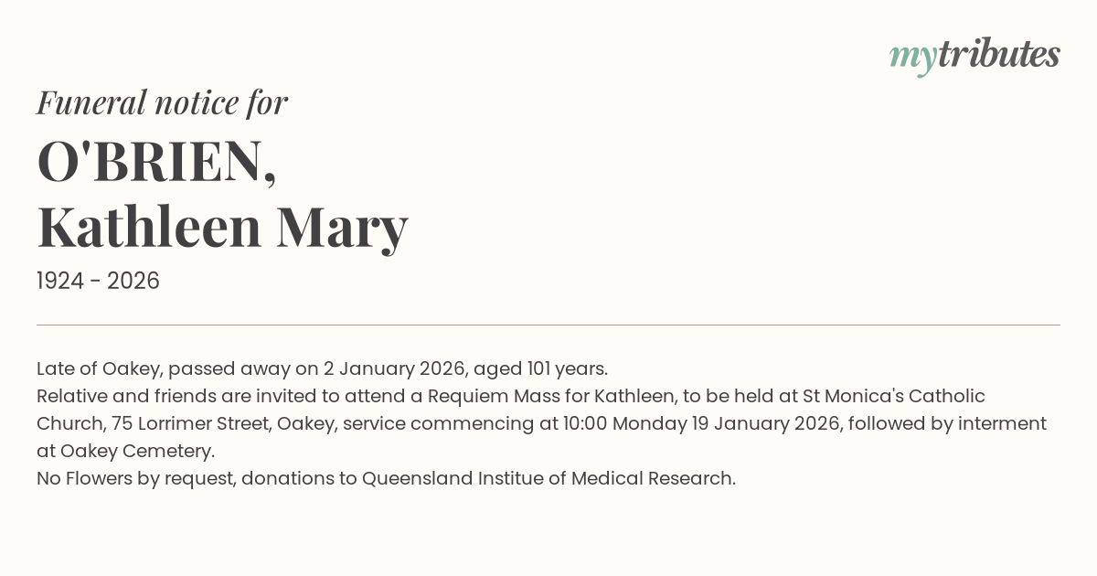 Relative and friends are invited to attend a Requiem Mass for Kathleen, to be held at St Monica's Catholic Church, 75 Lorrimer Street, Oakey, service commencing at 10:00 Monday 19 January 2026, followed by interment at Oakey Cemetery.