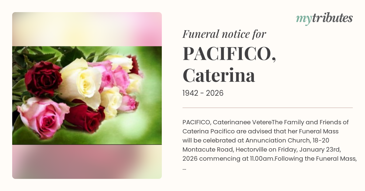 The Family and Friends of Caterina Pacifico are advised that her Funeral Mass will be celebrated at Annunciation Church, 18-20 Montacute Road, Hectorville on Friday, January 23rd, 2026 commencing at 11.00am.