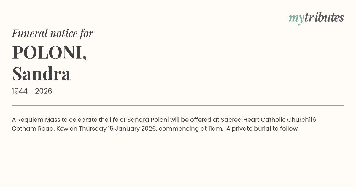21°CA Requiem Mass to celebrate the life of Sandra Poloni will be offered at