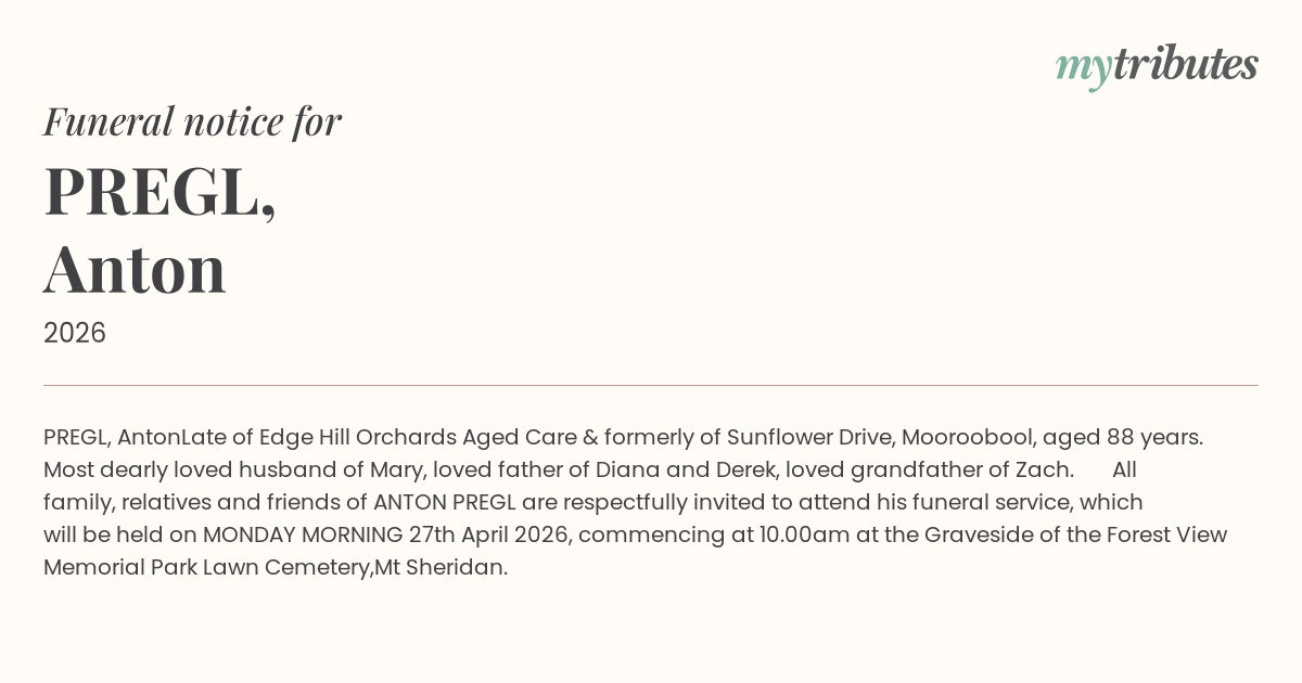 All family, relatives and friends of ANTON PREGL are respectfully invited to attend his funeral service, which will be held on MONDAY MORNING 27th April 2026, commencing at 10.00am at the Graveside of the Forest View Memorial Park Lawn Cemetery,
