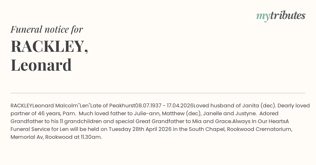A Funeral Service for Len will be held on Tuesday 28th April 2026 in the South Chapel, Rookwood Crematorium, Memorial Av, Rookwood at 11.30am.