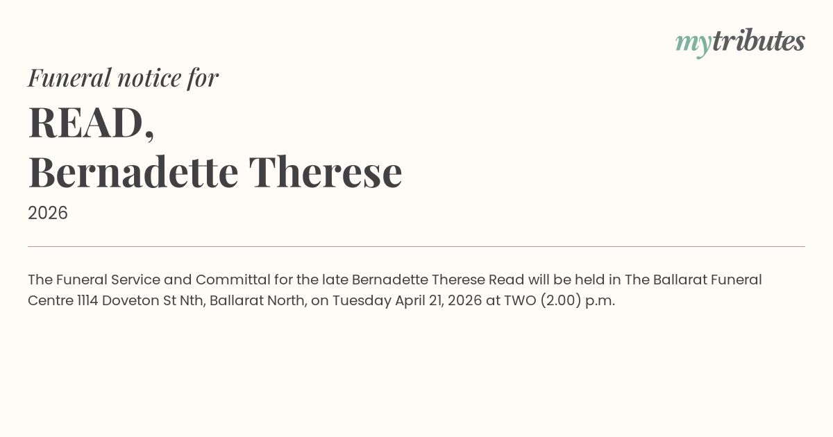 The Funeral Service and Committal for the late Bernadette Therese Read will be held in “The Ballarat Funeral Centre” 1114 Doveton St Nth, Ballarat North, on Tuesday April 21, 2026 at TWO (2.00) p.m.
