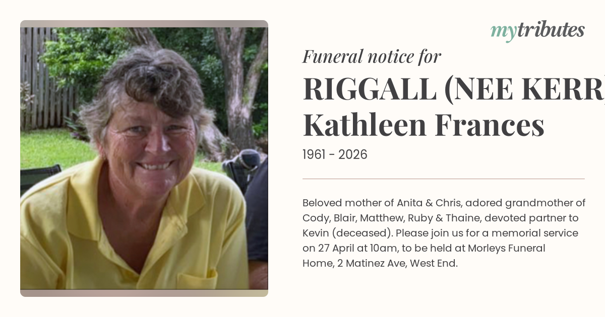 21°CBeloved mother of Anita & Chris, adored grandmother of Cody, Blair, Matthew, Ruby & Thaine, devoted partner to Kevin (deceased). Please join us for a memorial service on 27 April at 10am, to be held at Morleys Funeral Home, 2 Matinez Ave, West End.