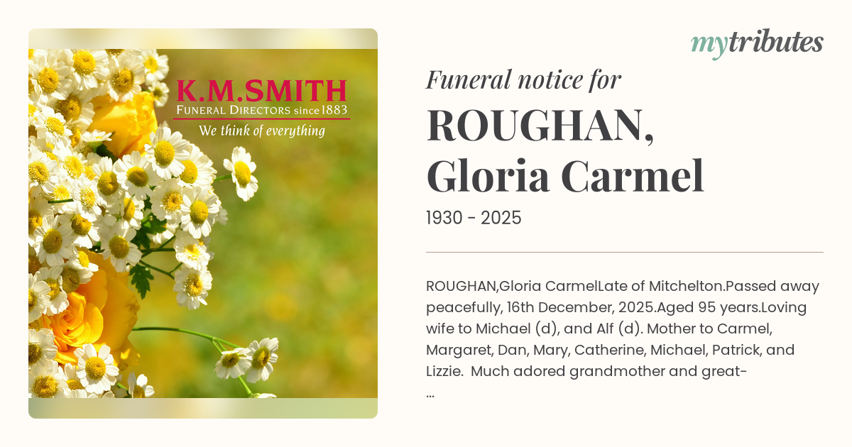 Loving wife to Michael (d), and Alf (d). Mother to Carmel, Margaret, Dan, Mary, Catherine, Michael, Patrick, and Lizzie. Much adored grandmother and great-grandmother.
