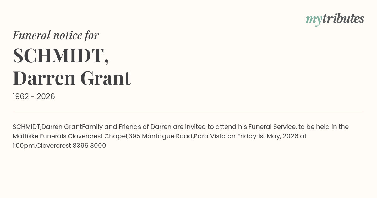 Family and Friends of Darren are invited to attend his Funeral Service, to be held in the Mattiske Funerals Clovercrest Chapel,