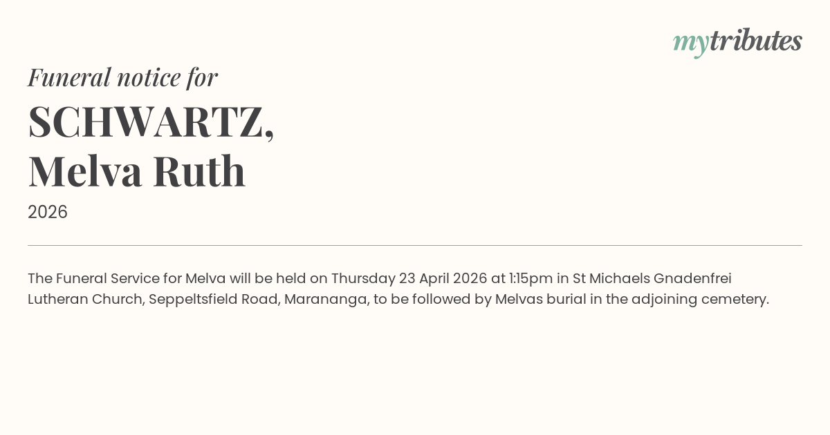 21°CThe Funeral Service for Melva will be held on Thursday 23 April 2026 at 1:15pm in St Michael’s Gnadenfrei Lutheran Church, Seppeltsfield Road, Marananga, to be followed by Melva’s burial in the adjoining cemetery.