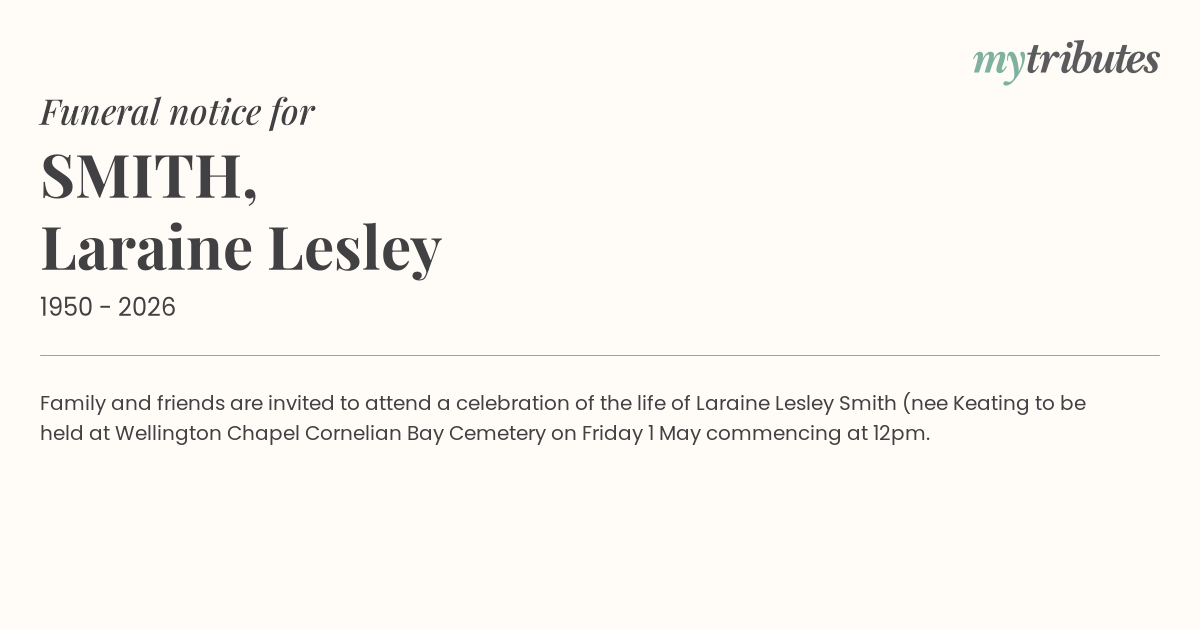 21°CFamily and friends are invited to attend a celebration of the life of Laraine Lesley Smith (nee Keating to be held at Wellington Chapel Cornelian Bay Cemetery on Friday 1 May commencing at 12pm.