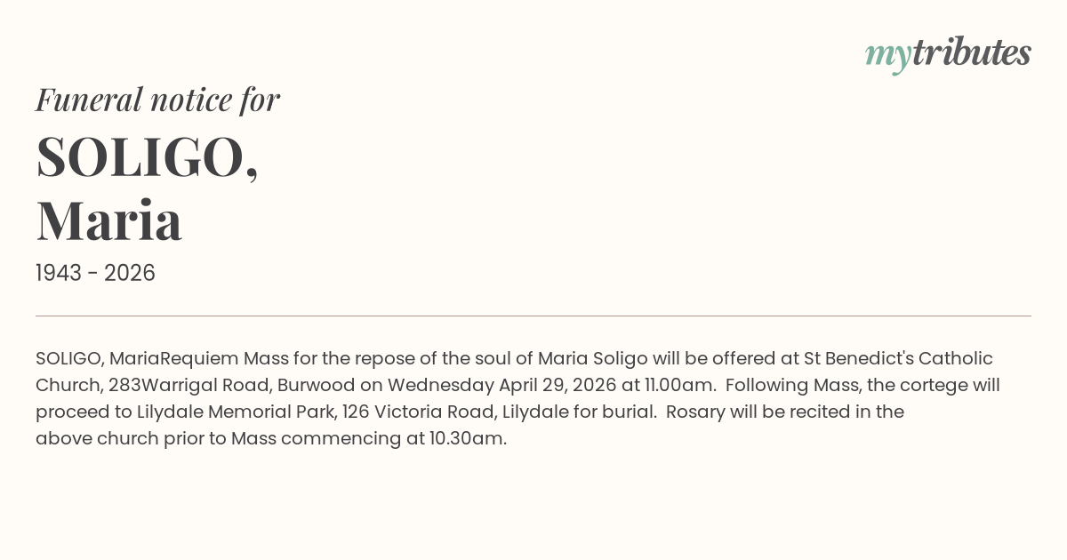 Requiem Mass for the repose of the soul of Maria Soligo will be offered at St Benedict's Catholic Church, 283Warrigal Road,