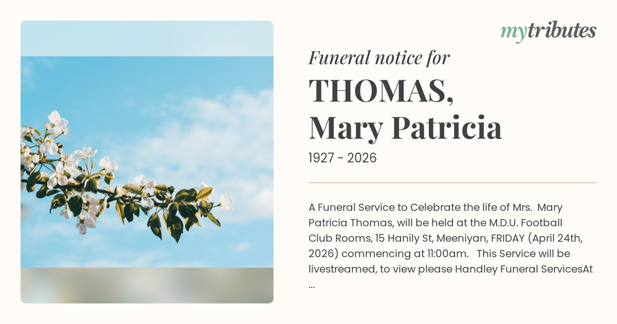 21°CA Funeral Service to Celebrate the life of Mrs. Mary Patricia Thomas, will be held at the M.D.U. Football Club Rooms, 15 Hanily St, Meeniyan, FRIDAY (April 24th, 2026) commencing at 11:00am.