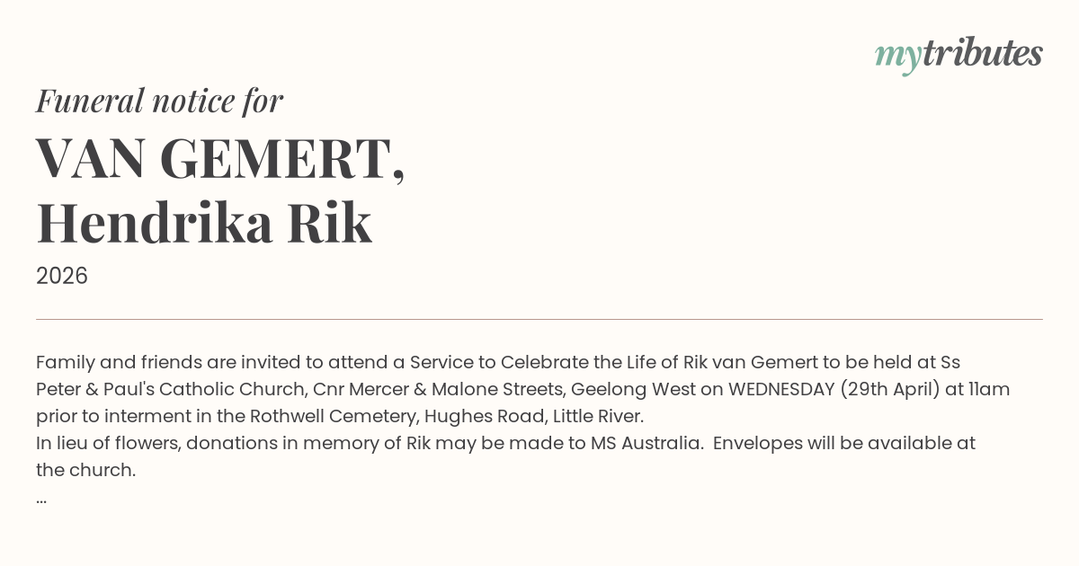 21°CFamily and friends are invited to attend a Service to Celebrate the Life of Rik van Gemert to be held at Ss Peter & Paul's Catholic Church, Cnr Mercer & Malone Streets, Geelong West on WEDNESDAY (29th April) at 11am prior to interment in the Rothwell Cemetery, Hughes Road, Little River.