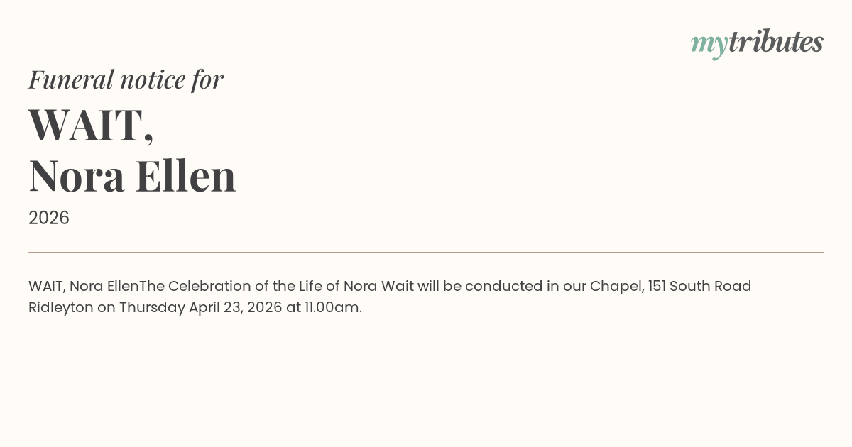 The Celebration of the Life of Nora Wait will be conducted in our Chapel, 151 South Road Ridleyton on Thursday April 23, 2026 at 11.00am.