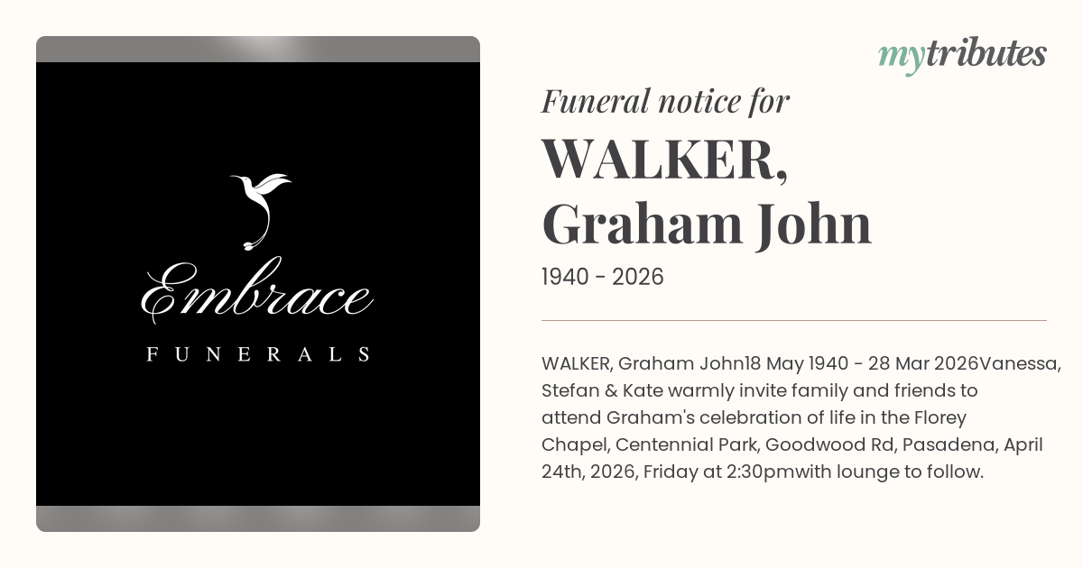 Vanessa, Stefan & Kate warmly invite family and friends to attend Graham's celebration of life in the Florey Chapel,