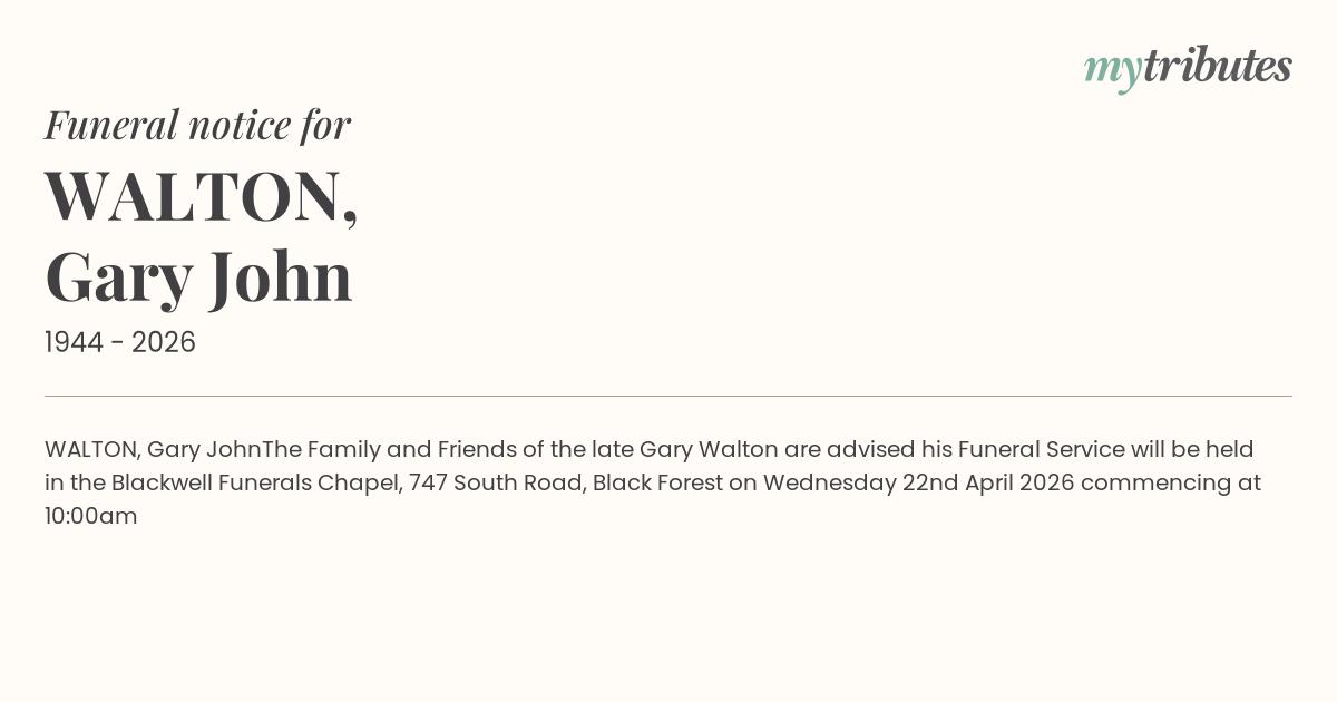 The Family and Friends of the late Gary Walton are advised his Funeral Service will be held in the Blackwell Funerals Chapel, 747 South Road, Black Forest on Wednesday 22nd April 2026 commencing at 10:00am