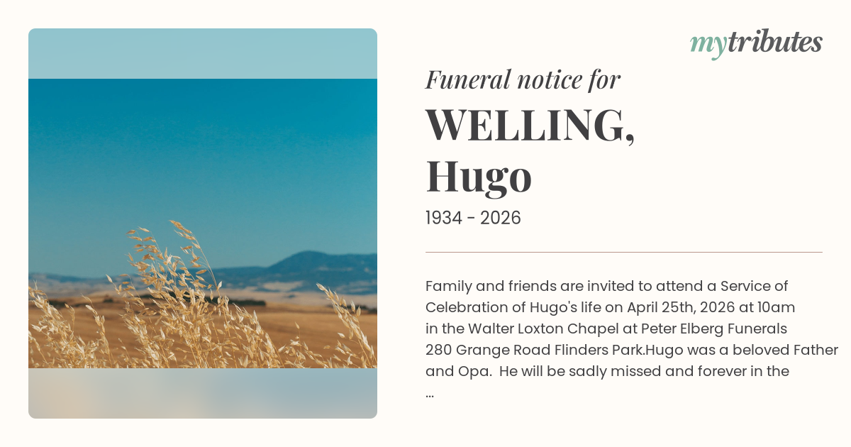 21°CFamily and friends are invited to attend a Service of Celebration of Hugo's life on April 25th, 2026 at 10am in the Walter Loxton Chapel at Peter Elberg Funerals 280 Grange Road Flinders Park.