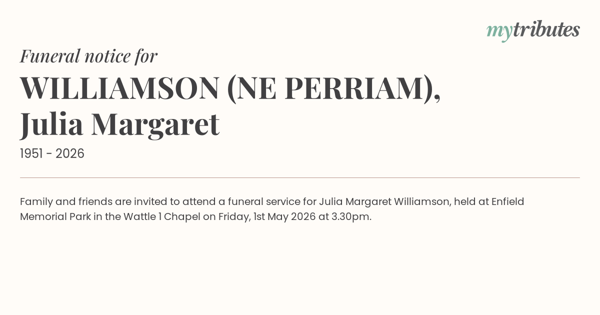 21°CFamily and friends are invited to attend a funeral service for Julia Margaret Williamson, held at Enfield Memorial Park in the Wattle 1 Chapel on Friday, 1st May 2026 at 3.30pm.